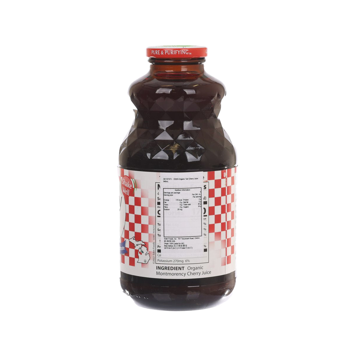 This juice is a pure juice of a valued heritage Montmorency tart cherry variety (Prunus cerasus). The cherries are grown on the brand’s family owned, organic orchards near the east shore of northern Lake Michigan, an ideal tree fruit producing area due to the seasonal lake effect. This awarded juice is a good source of nutrients, perfect to be enjoyed when on the go, at school, work, or home.