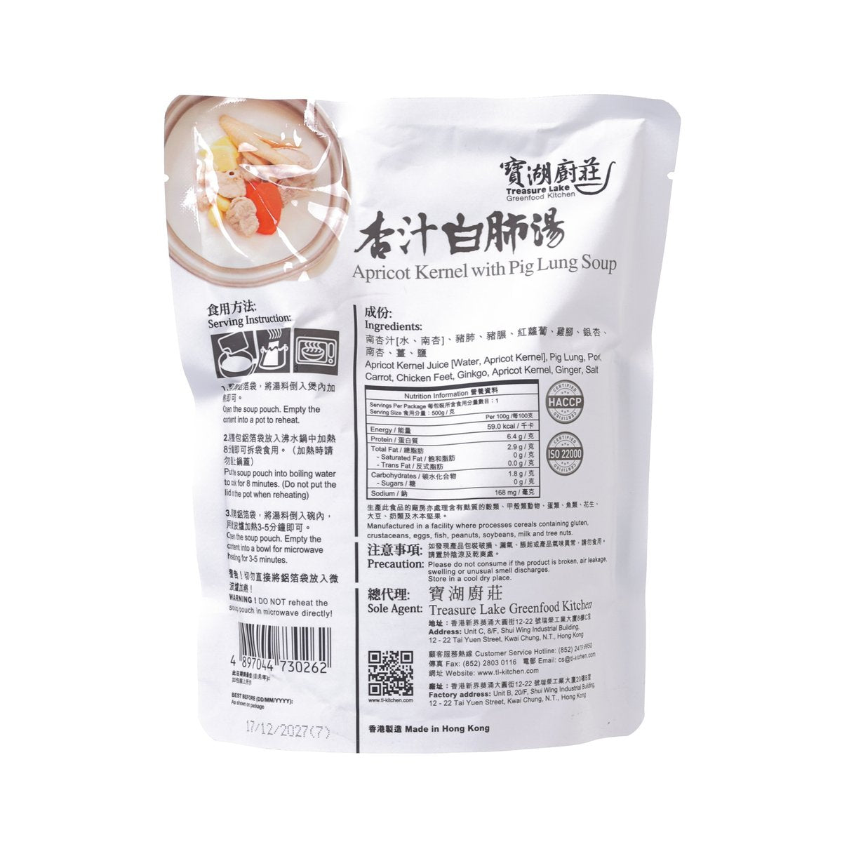 High-quality apricot kernels are made in the way of hand-grinding, moisturizing apricot kernel juice, and the taste is fragrant and smooth; It is then used to deal with the complicated steps of washing pig lungs, so as to good for lung and skin health, which is especially suitable for drinking in autumn and winter. 100% Made in Hong Kong. No MSG added. No preservatives added. No artificial colours added.