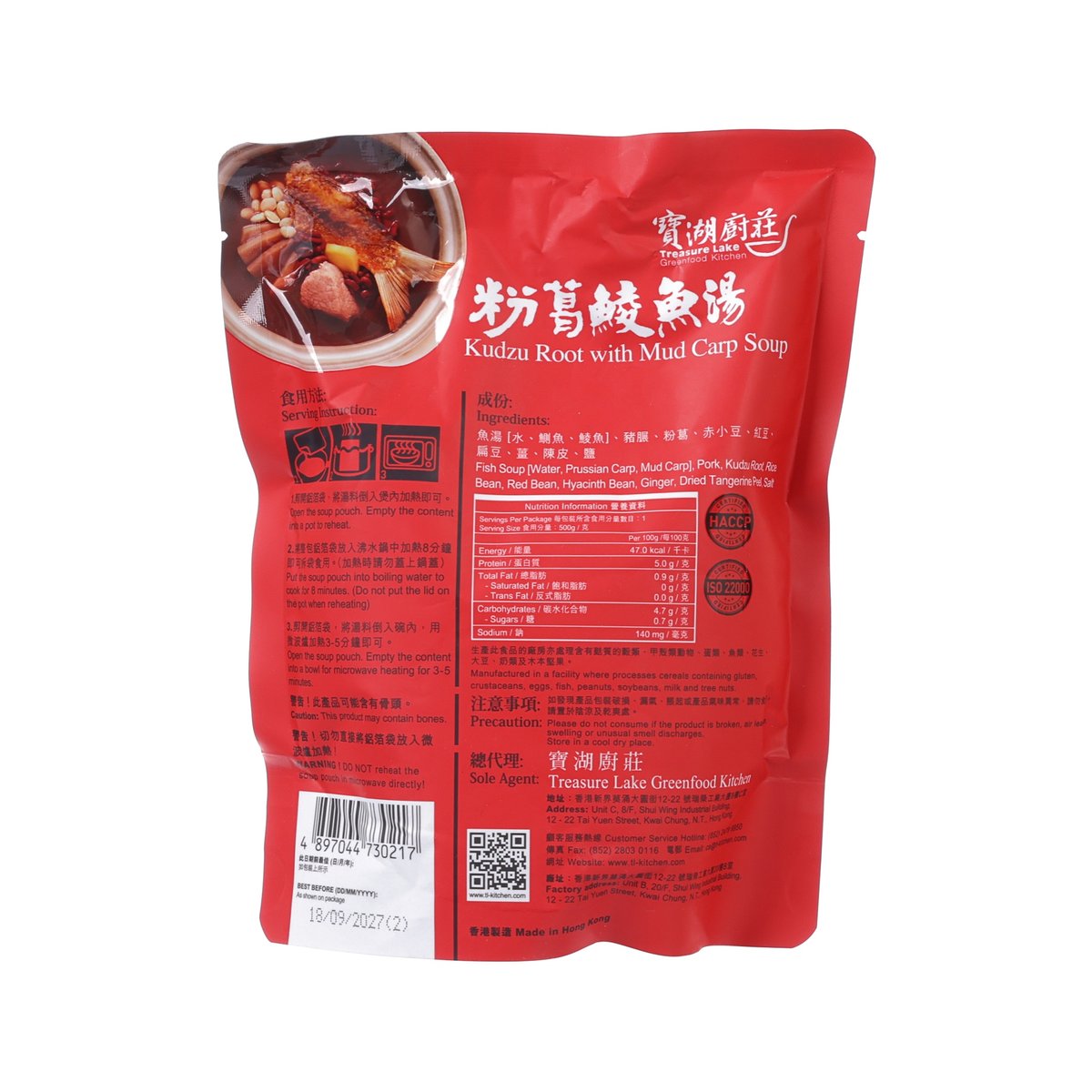 Mud carp stewed with kudzu root and other selected ingredients is a famous soup in Guangdong, which is an excellent tonic soup for urban people who always stay up late and work overtime. This soup can help refresh people and relieve fatigue. 100% Made in Hong Kong. No MSG added. No preservatives added. No artificial colours added.