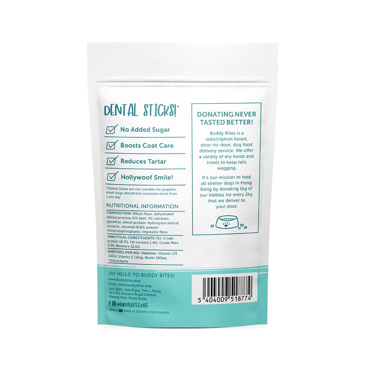 照顧你的狗狗,同時照顧他們的牙齒和牙齦!! Buddy Bites 潔齒棒不添加糖分,有助於防止牙垢增生。不僅如此,獲專業獸醫認可的成分還可以促進狗狗皮毛護理!