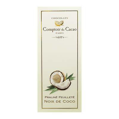 COMPTOIR DU CACAO is a family-run artisan chocolate factory located in the heart of the French countryside, creating the fine, single-origin, pure cacao butter chocolates in the unique, new flavours following the artisan tradition of the great chocolate masters. The gourmand creations of this Flaky Praline collection, were awarded twice at the “Salon du Chocolat de Paris”. Bursting the aroma and flavour of coconut, this chocolate bar from the collection is the must for the lovers of coconut.