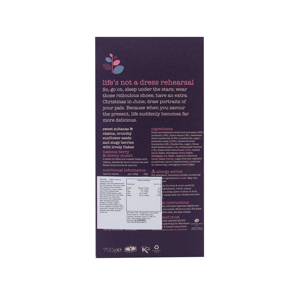 英國品牌DORSET成立於1989年,總部位於多塞特郡,一直提供優質穀物,每款穀類早餐都是水果、堅果和種子的獨特組合。而這款是混合了烤燕麥、全麥片、提子乾、葵花籽和車厘子乾、紅桑子乾、藍莓乾、黑加侖子乾。非常適合那些莓果迷享用呢!