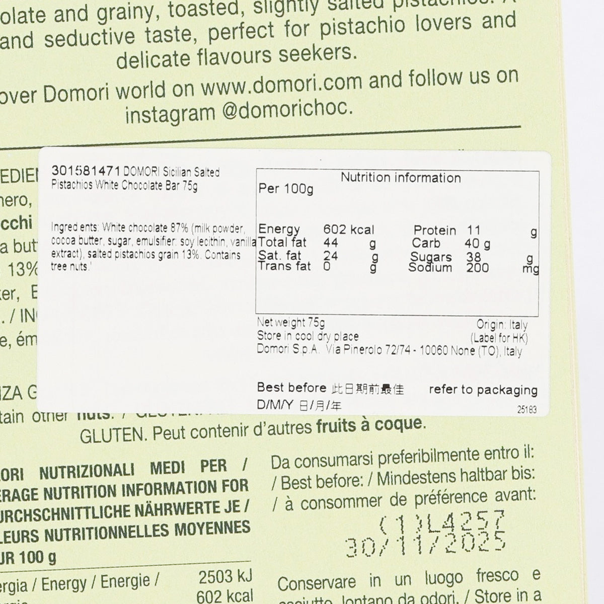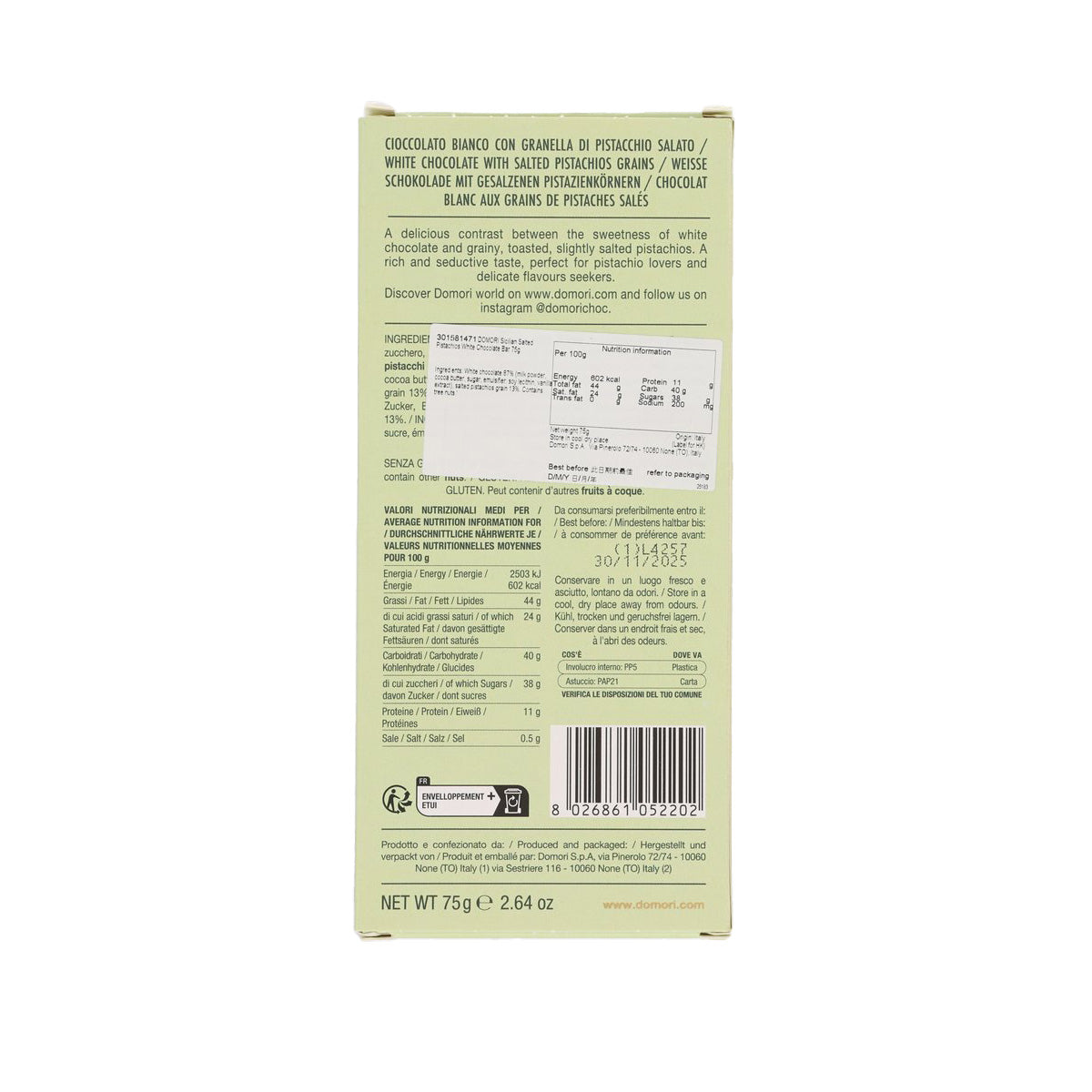 DOMORI Sicilian Salted Pistachios White Chocolate Bar (75g)